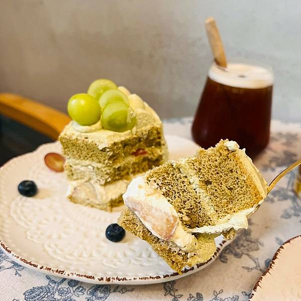 戚風蛋糕是六吋切4份的大小, 蠻大一塊的捏, 入口後就會有鮮奶油帶出的茉莉香氣衝出, 妮可其實平常不喝茉莉綠, 但這個可以, 有茉莉香但不過重!! 蛋糕本身沒特別的茶香, 不過很柔軟, 搭配上新鮮的綠葡萄以及香甜的水蜜桃, 很讚耶!! 中間還夾有葡萄柚點綴, 完全不膩口的說, 推推!!